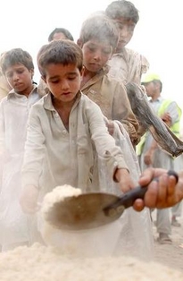 Dry ration packages are given to poor families as well as survivors of disasters. Though the nature of food supplies vary based on the regions of distribution, a typical, dry ration package consists of flour, rice, lentils, dates, dry milk powder, sugar, tea, spices, oil, and soap. Each package is enough to feed a family of about 5 or 6 for a month.